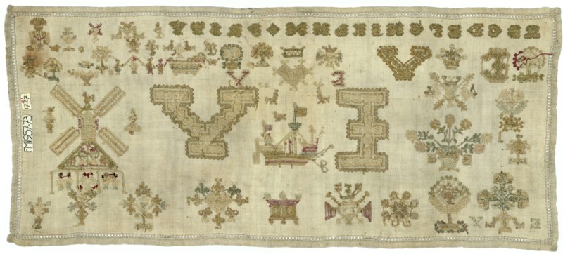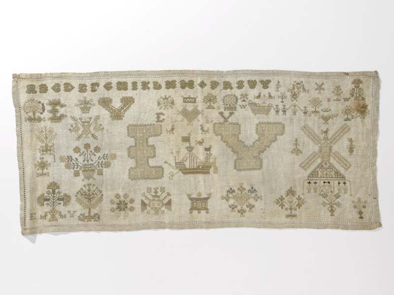 Lettermerklap met grote initialen en een molen, gemerkt E.V. of E.W. 1727