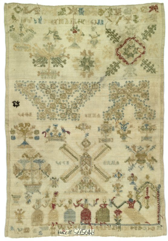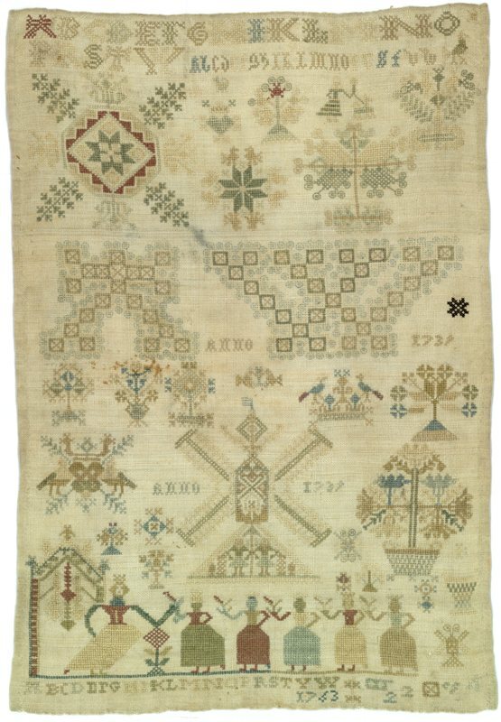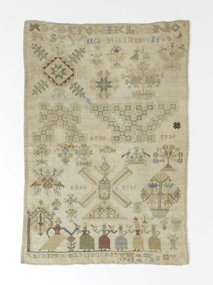 Merkletterlap met molen en rij wijze maagden, gemerkt A.W. 1739
