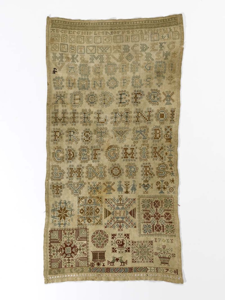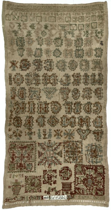 Lettermerklap met beige, blauwgroen en rood, vuil, gemerkt H.I.D. 1708-1711
