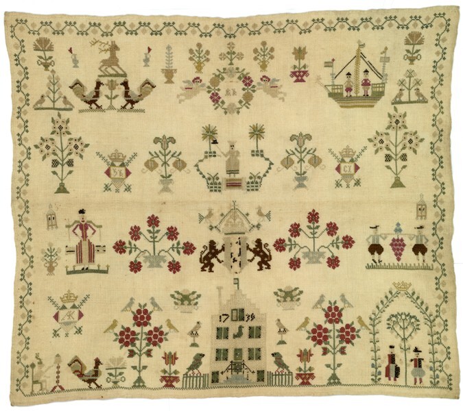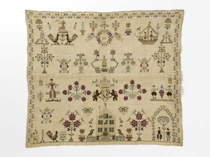 Merklap met trapgevelhuis, weeskinderen en wapen van Amsterdam, gemerkt A.K. 1739