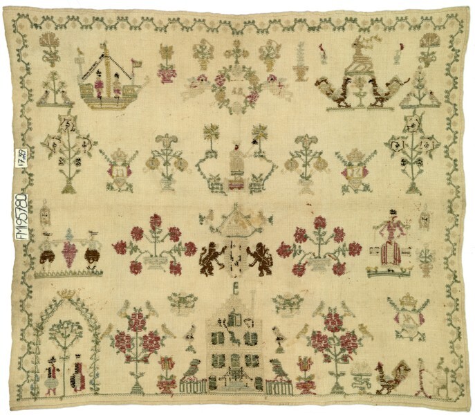 Textielwerken, meestal van fijne stof, waarop door vrouwen en meisjes in verschillende steken is geborduurd en die bedoeld zijn om in te lijsten. Ze werden doorgaans gemaakt door beginnelingen om hun vaardigheden te tonen. Kenmerkend zijn een combinatie van steken, motieven, letters en verzen, en vaak de voltooiingsdatum en de naam van de borduurster. (AAT-Ned)