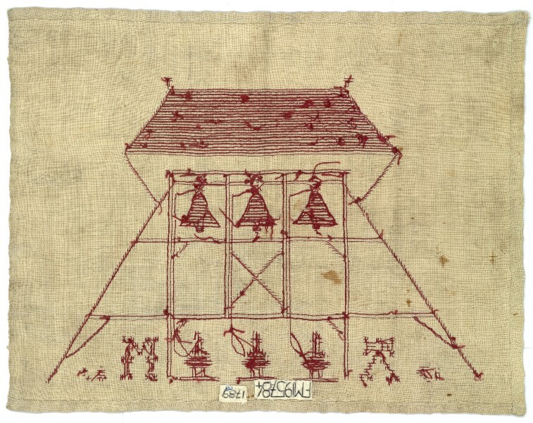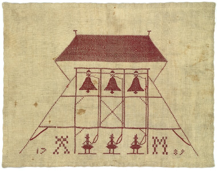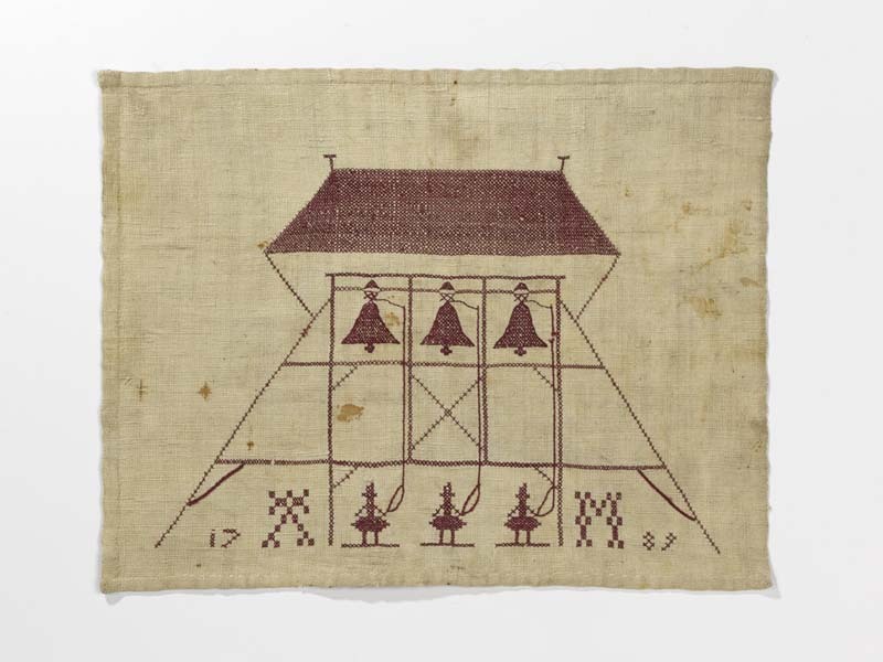 Borduurlap met klokkenstoel, gemerkt A.M. 1789