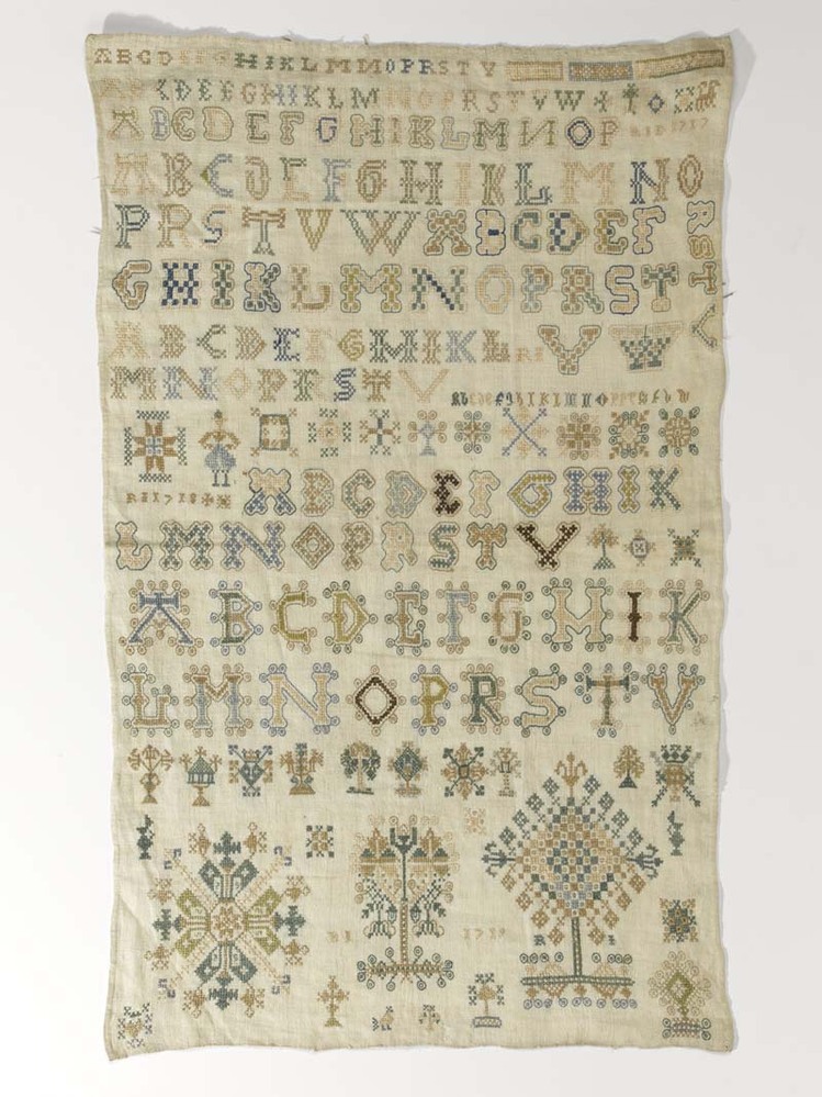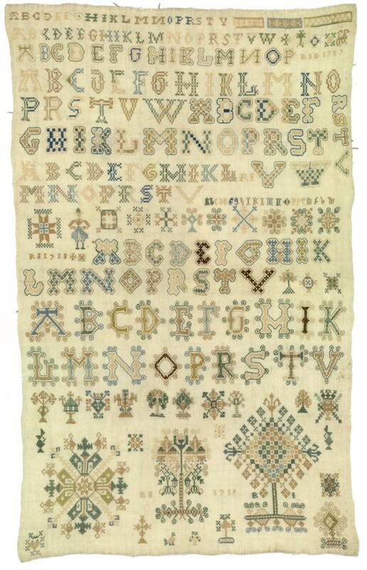 Lettermerklap met kruisjes over drie draden, gemerkt R.I. , 1717-1719
