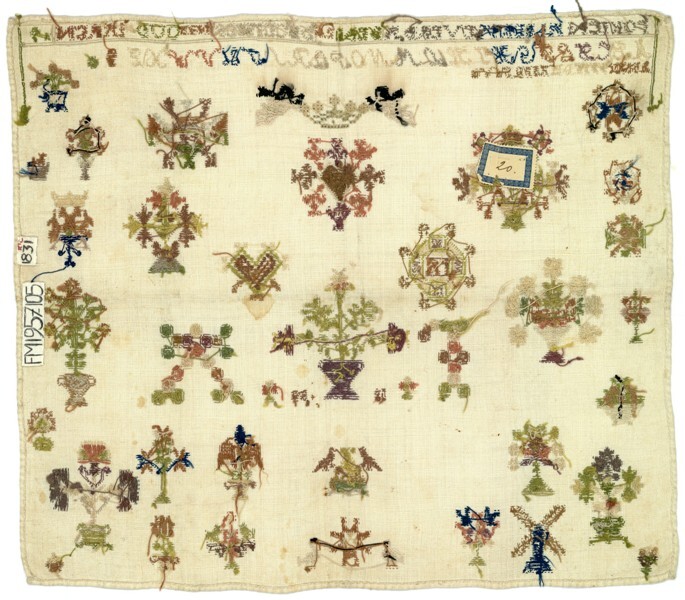 Merkletterlap met bloempotten op fijn linnen, gemerkt Fokjen Alberts Everda, 1831
