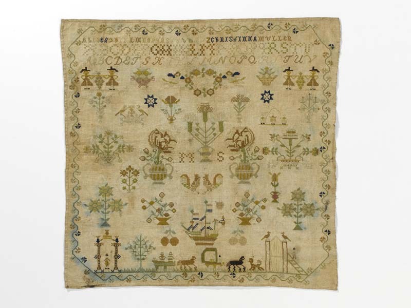 Merkletterlap met uitgelopen blauwe vlekken, gemerkt Christina Muller 1833