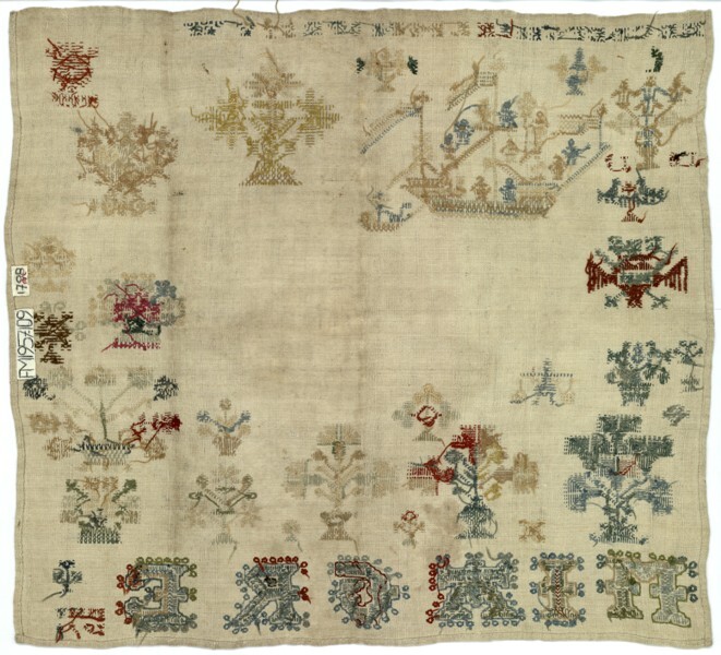 Merkletterlap met driemaster en bloempotten, onaf, gemerkt M.H.V., 1798, later gedateerd 1813