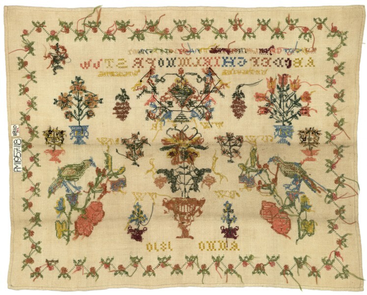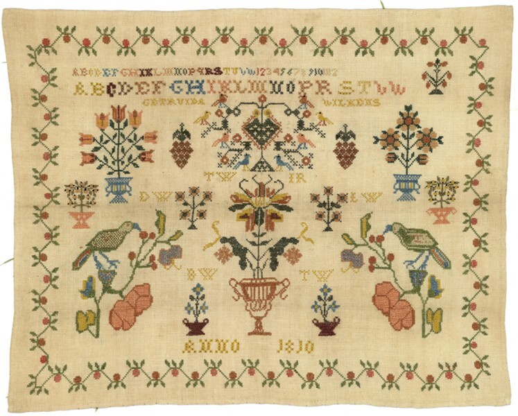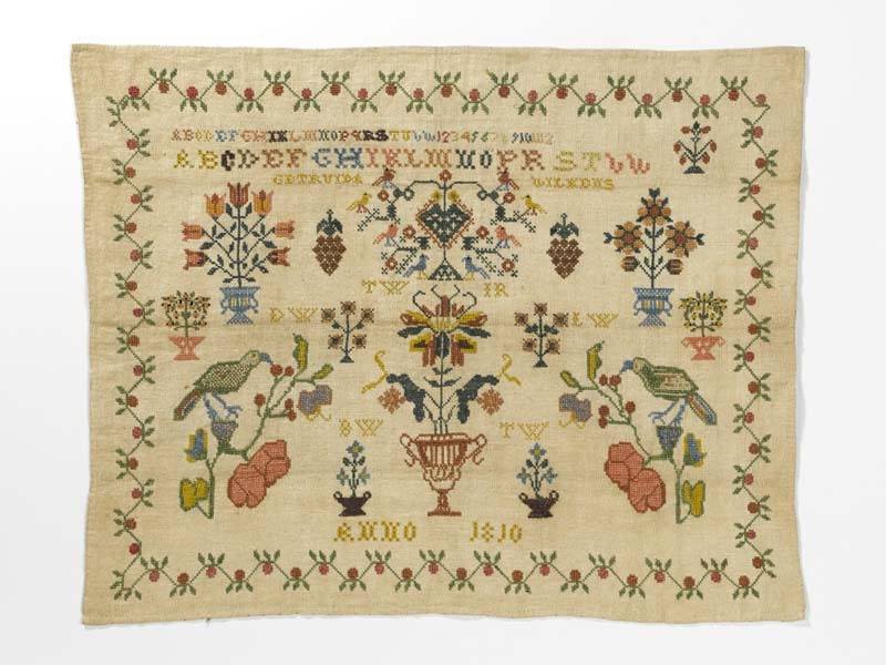 Merkletterlap met papegaaien, gemerkt Getruida Wilkens anno 1814