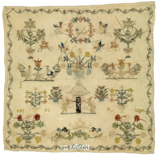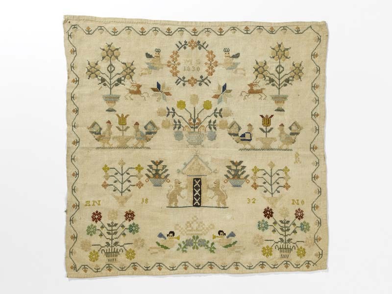 Textielwerken, meestal van fijne stof, waarop door vrouwen en meisjes in verschillende steken is geborduurd en die bedoeld zijn om in te lijsten. Ze werden doorgaans gemaakt door beginnelingen om hun vaardigheden te tonen. Kenmerkend zijn een combinatie van steken, motieven, letters en verzen, en vaak de voltooiingsdatum en de naam van de borduurster. (AAT-Ned)