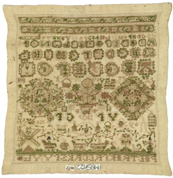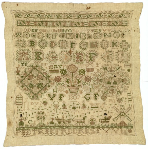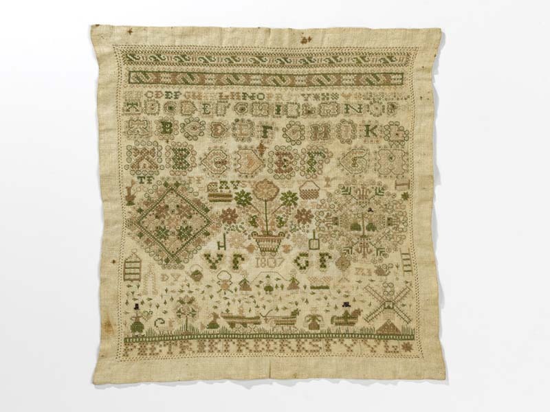 Merkletterlap in beige met groen, gemerkt Pietrik Freerks 1807