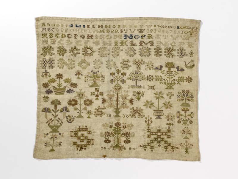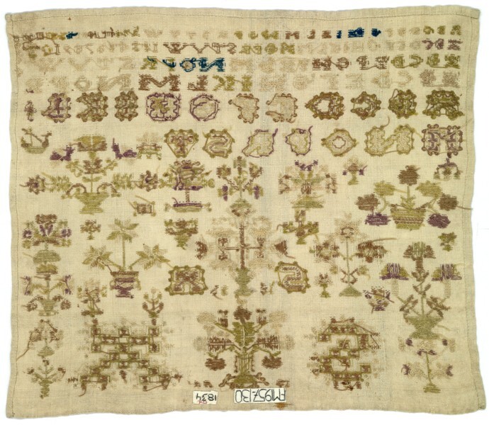 Merkletterlap, beige met groen, gemerkt S.A. 1834-1836