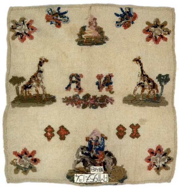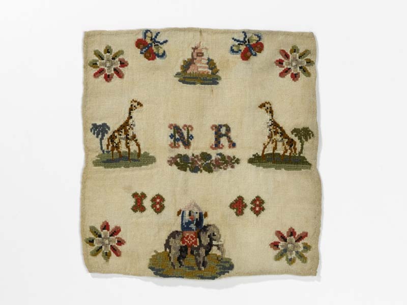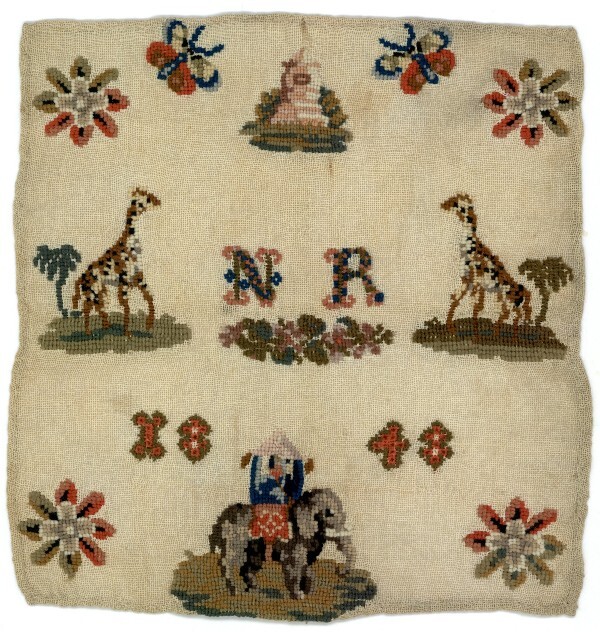 Merklap met olifant en giraffes, gemerkt N.R. 1848