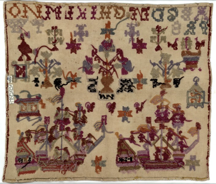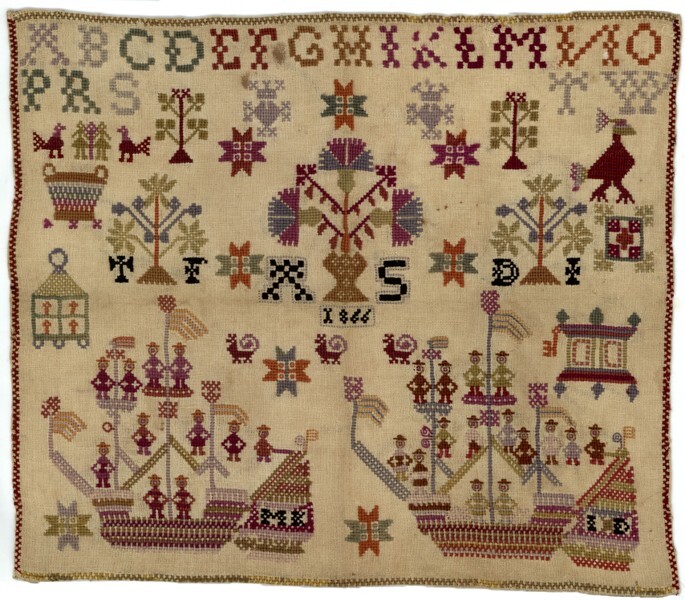 Merkletterlap met schepen, gemerkt A.S. 1866