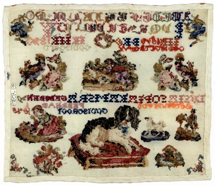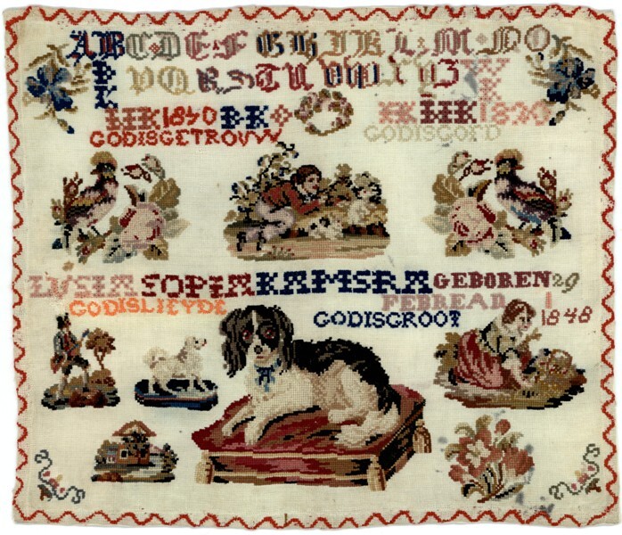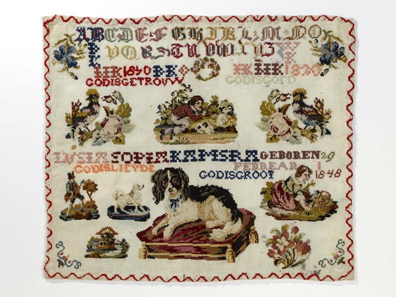 Lettermerklap met hondje gemerkt Lusia Sopia Kamstra, geboren 29 februari 1848, ongedateerd