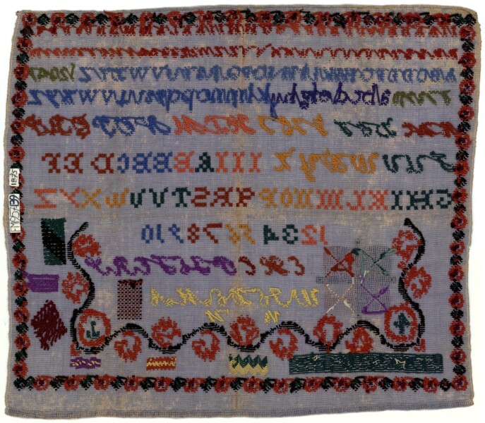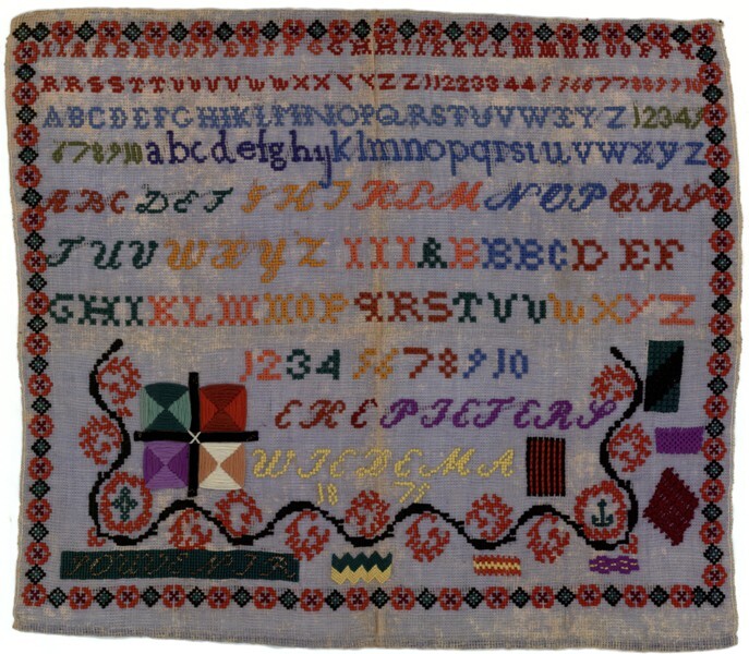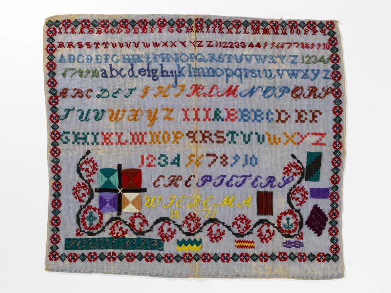 Merkletterlap op blauw stramien, gemerkt Eke Pieters Wiedema, 1875