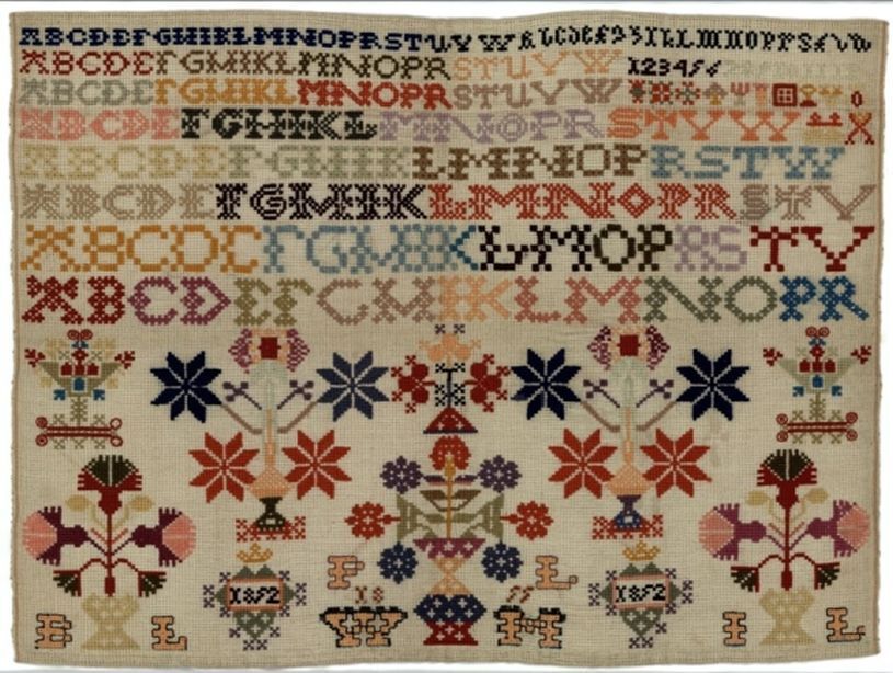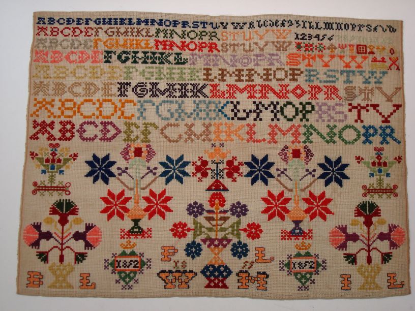Merkletterlap met wol, met 9 alfabetten en eronder bloempotten, gemerkt W.M. 1852-1855,