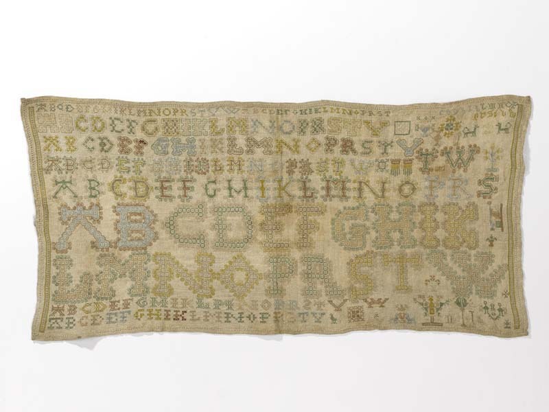 Letterlap van linnen, geborduurd met zijden garen, vrijwel geheel gevuld met alfabetten op negen rijen met letters, aangevuld met enkele motiefjes, geen initialen en ongedateerd.