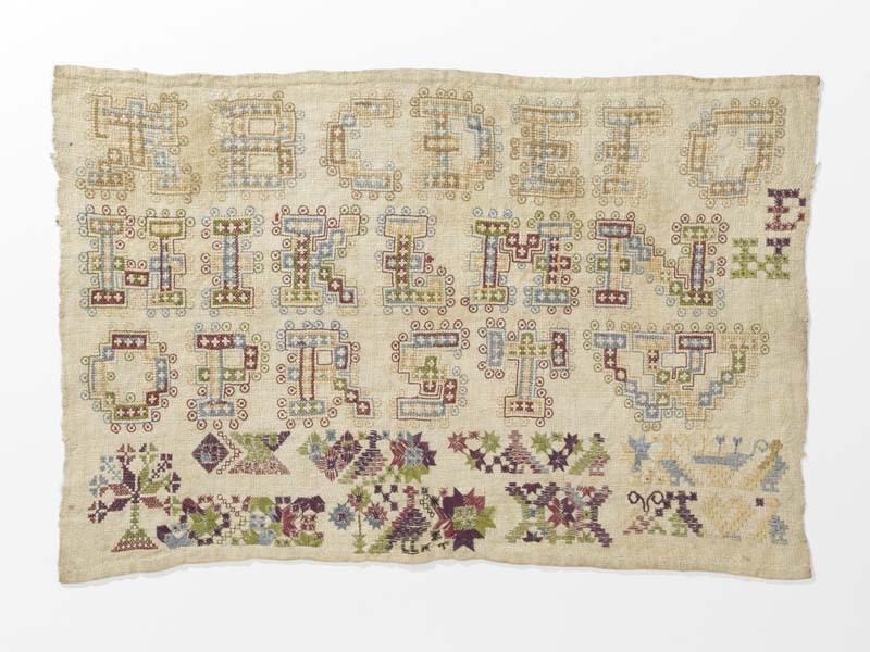 Lettermerklap met, alfabet van grote letters op drie regels, en hemdboordranden, initialen HE, ongedateerd.