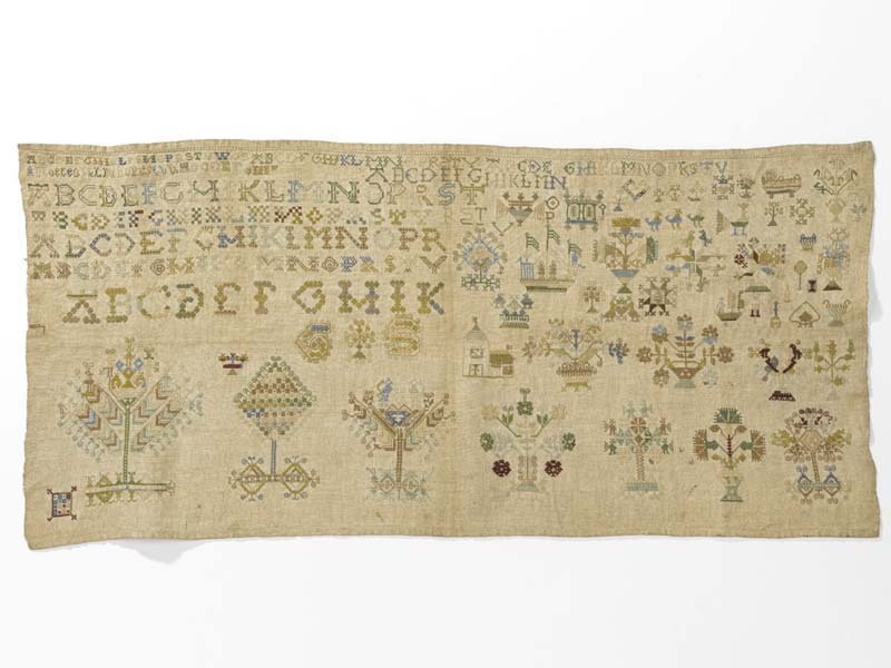 Merkletterlap met alfabet, motieven, kast met sleutel, wieg, boot, levensboompjes, levensbomen, initialen GS, geen jaartal