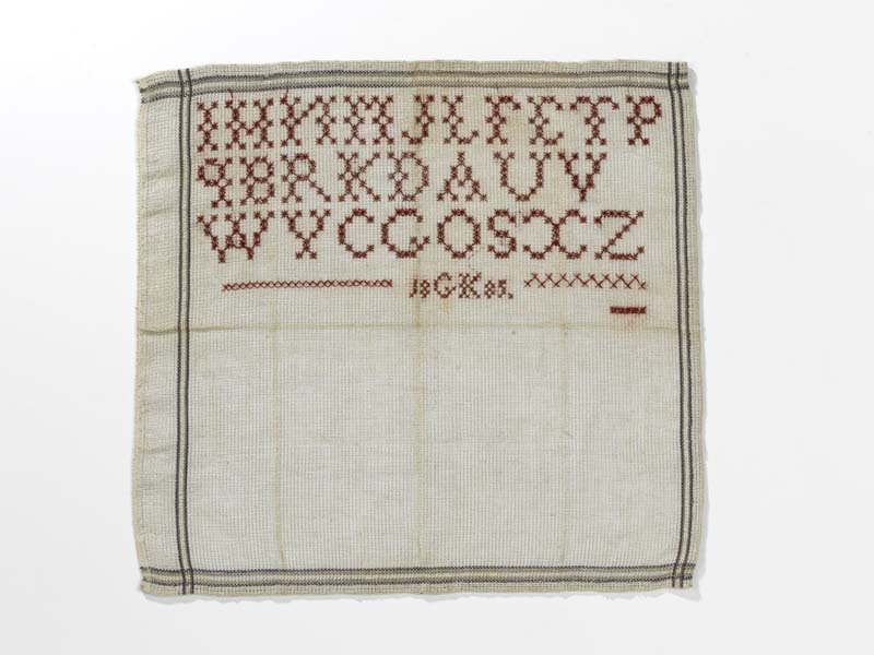 Letterlapje, de letters niet in volgorde van moeilijkheid, opengewerkte letters op stramien, het lapje gedeeltelijk bewerkt, initialen GK 1885
