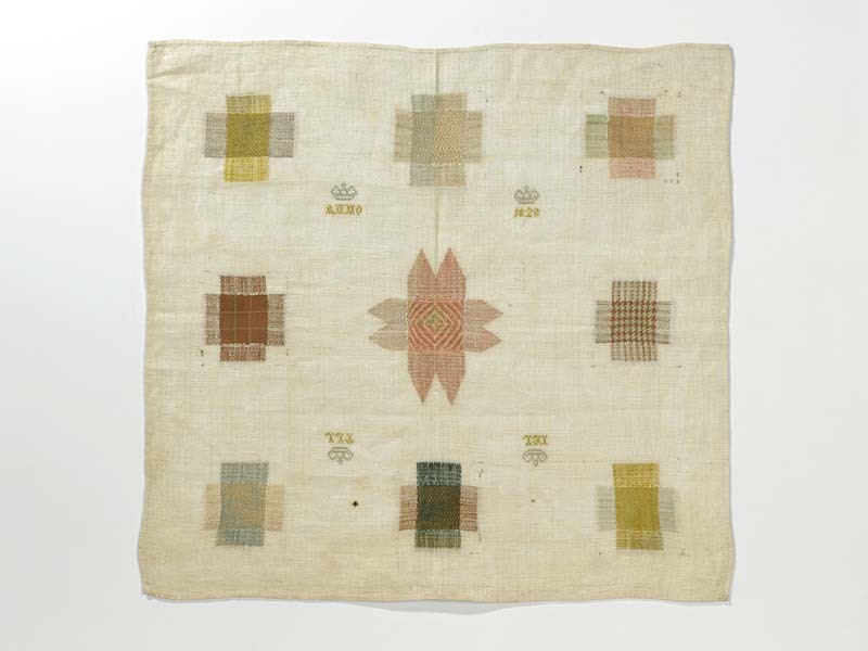 Stoplap van linnen, geborduurd met zijden garen, met 9 stoppen, gemerkt ANNO- 1828- I.E.R.-T.L.C