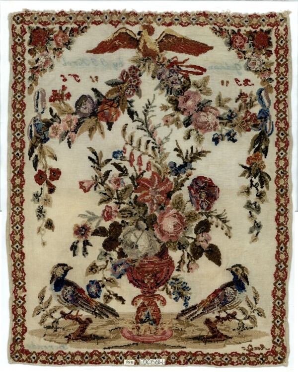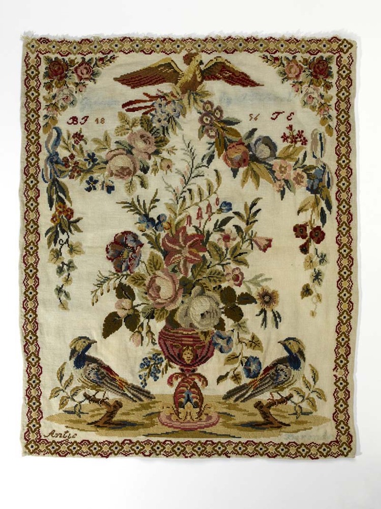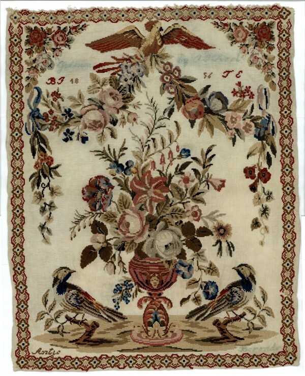 Borduurstuk met bloemvaas, gemerkt Antje Berends 1856