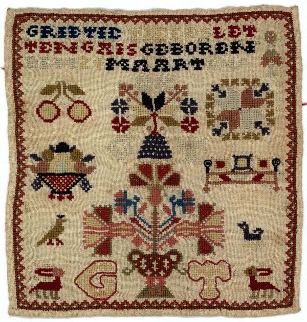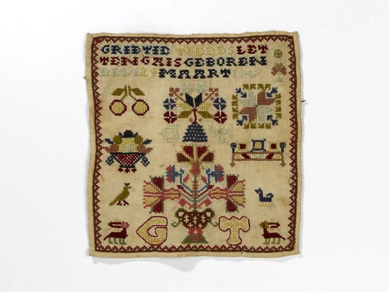 Merklapje, vierkant, tekst: Grietje Tieeds Lettenga is geboren den 24 maart 1845