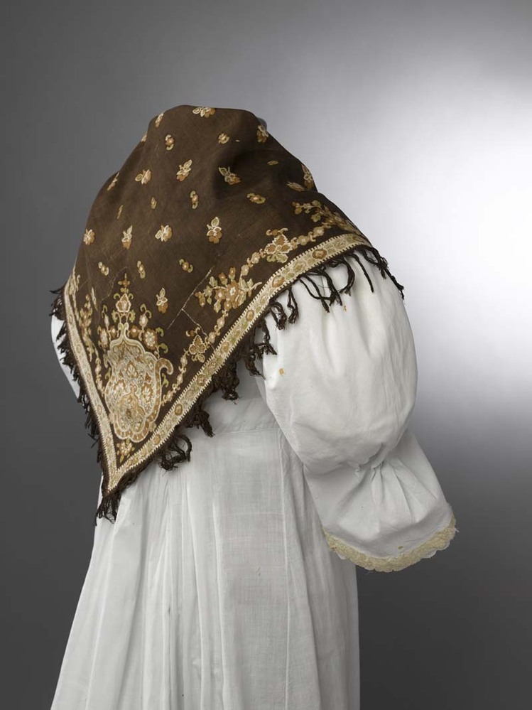 1) hals- of hoofddoek die met een tip (uiteinde) op de rug wordt vastgespeld. https://data.cultureelerfgoed.nl/term/id/cht/00c8692f-af9f-490f-b4ec-ec045b417f30