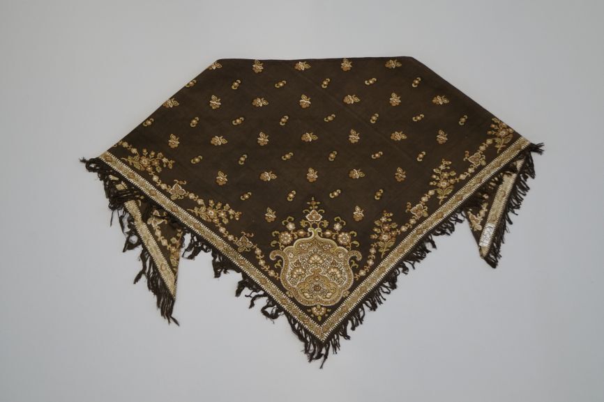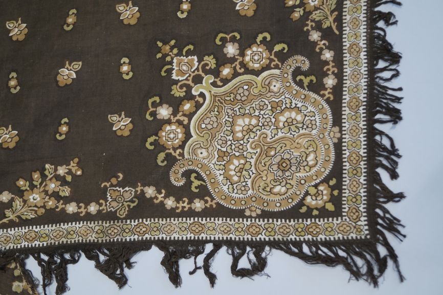 Donkerbruine driekante katoenen doek met bloemenranden en bloemmotiefjes