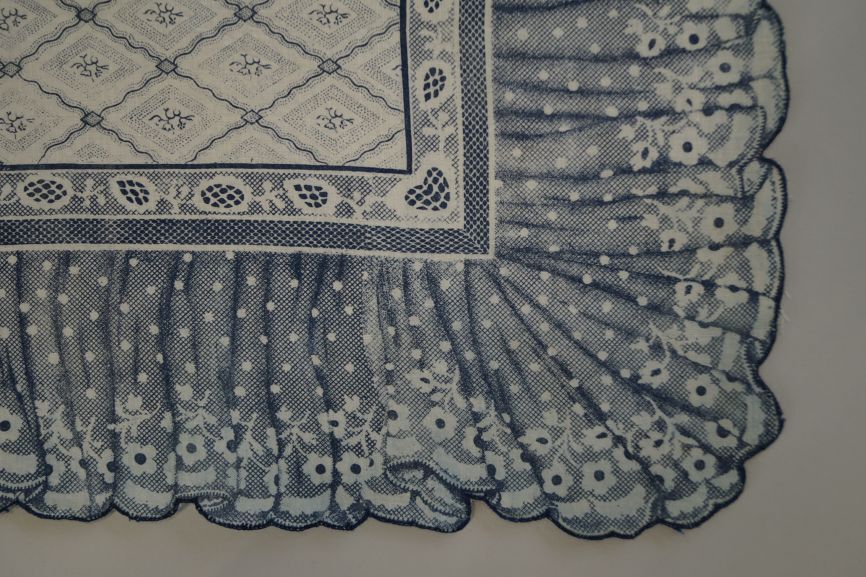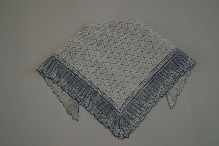 Witte driekante bedrukte katoenen doek met een ruitmotiefje met bloempjes en gerimpelde kantstrook met driedimensionaal effect
