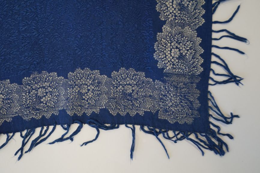Blauwe zijden driekante sjaal of tipdoek met ingeweven bloemmotief