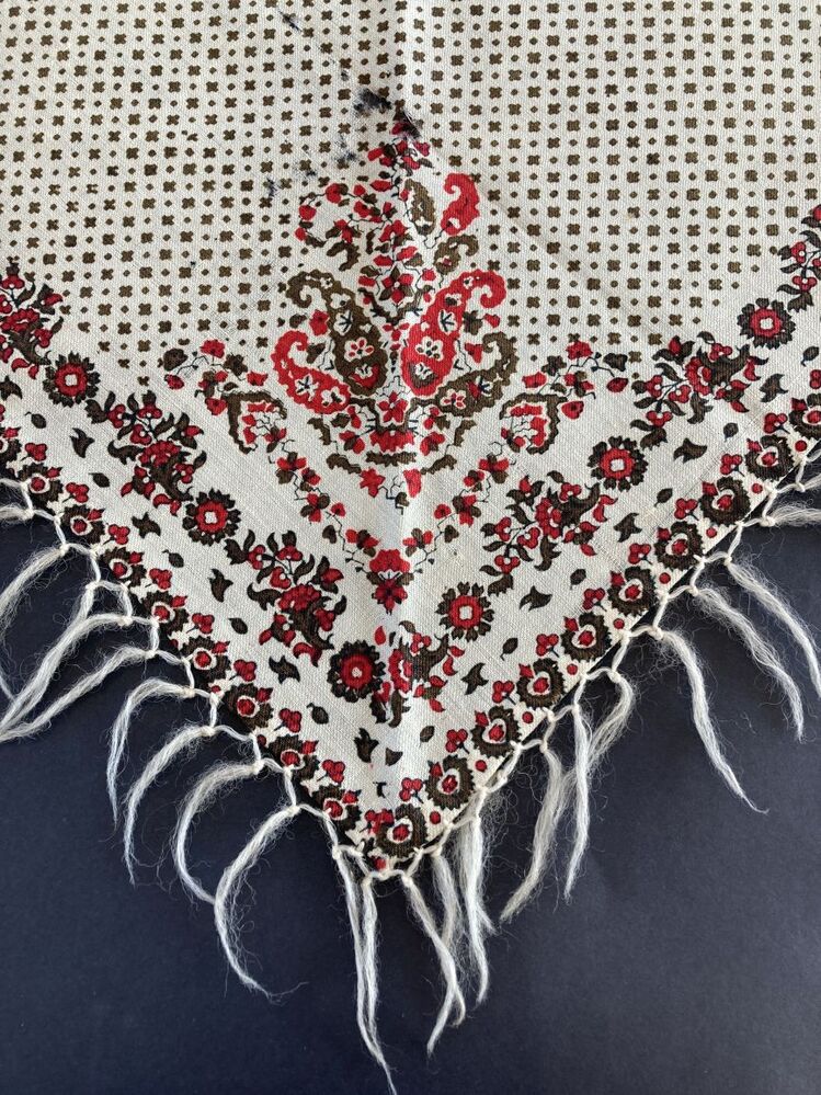 Driekante tipdoek van wol met bloemenrand, en hoekmotief met buta-motieven