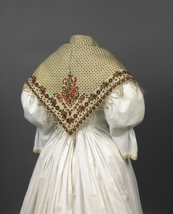 1) hals- of hoofddoek die met een tip (uiteinde) op de rug wordt vastgespeld. https://data.cultureelerfgoed.nl/term/id/cht/00c8692f-af9f-490f-b4ec-ec045b417f30