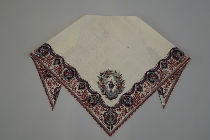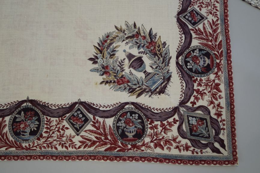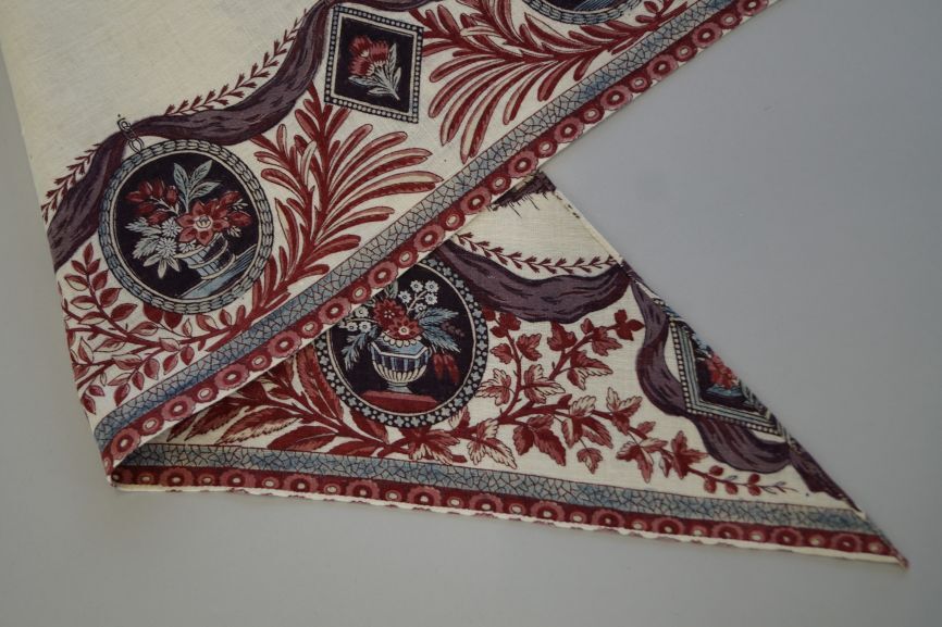 Driekante katoenen doek bedrukt met rand van guirlandes met ronde ruitvormige medaillons