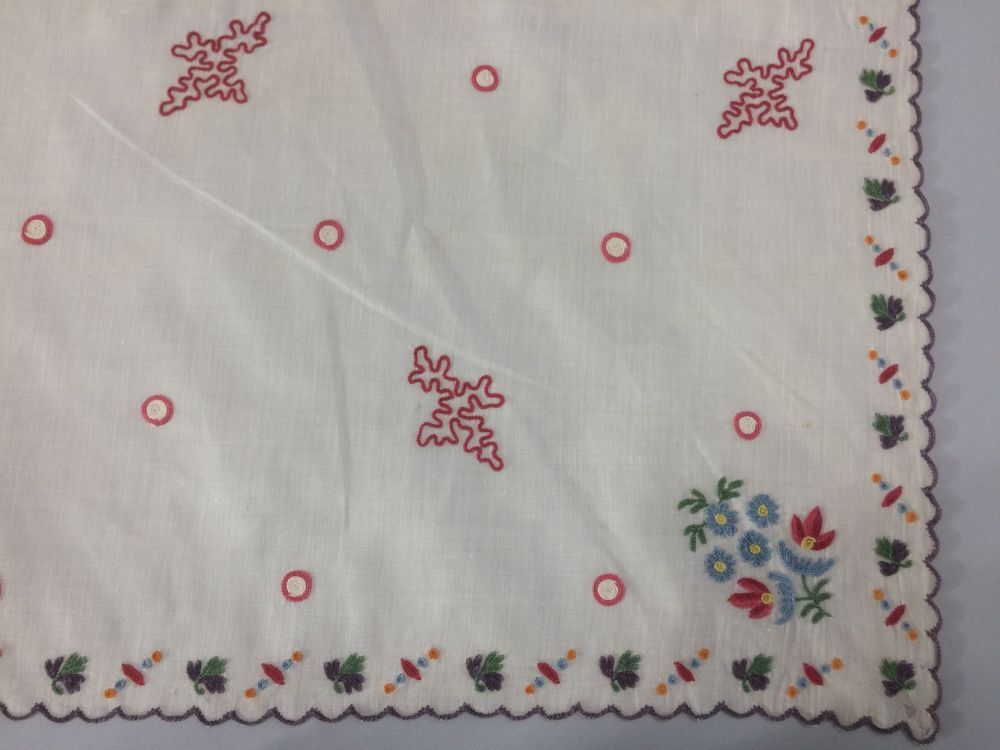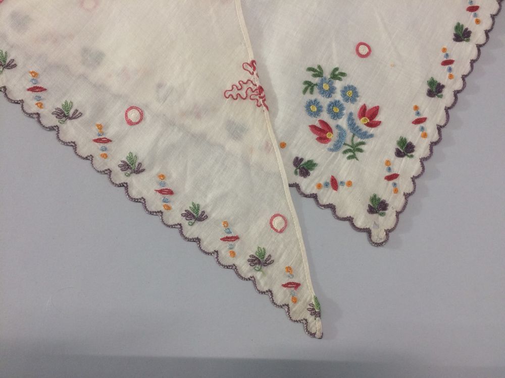 Fichu met tamboereerwerk met grillige motieven en in de rechte hoek een symmetrisch bloemboeketje