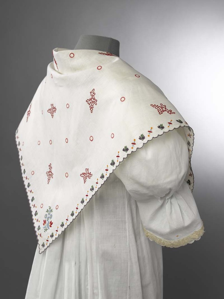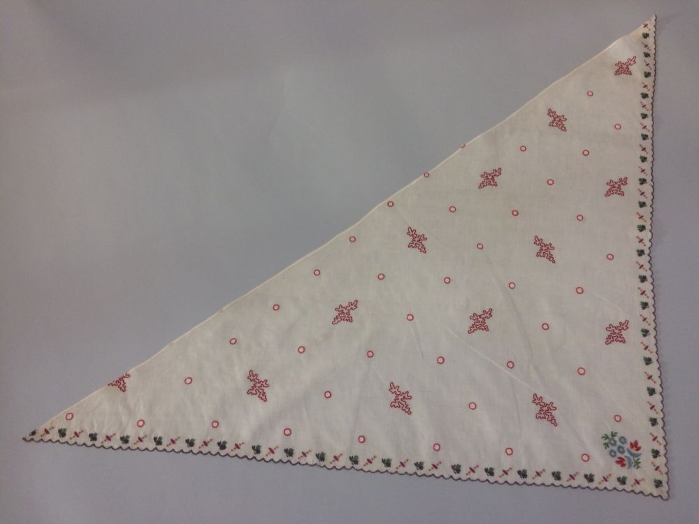 1) hals- of hoofddoek die met een tip (uiteinde) op de rug wordt vastgespeld. https://data.cultureelerfgoed.nl/term/id/cht/00c8692f-af9f-490f-b4ec-ec045b417f30