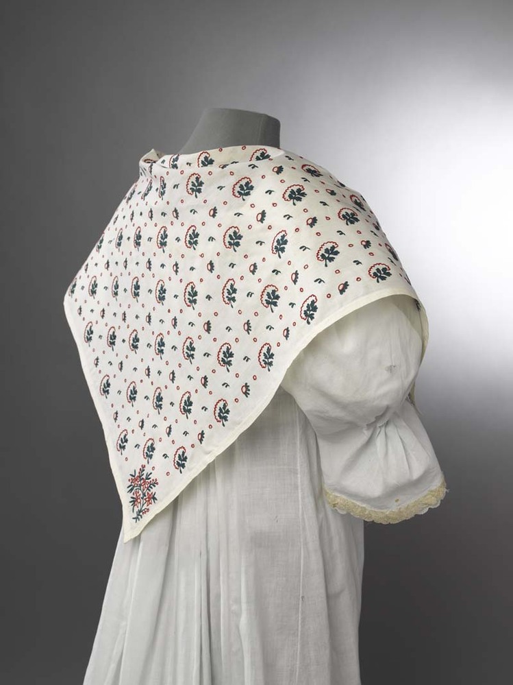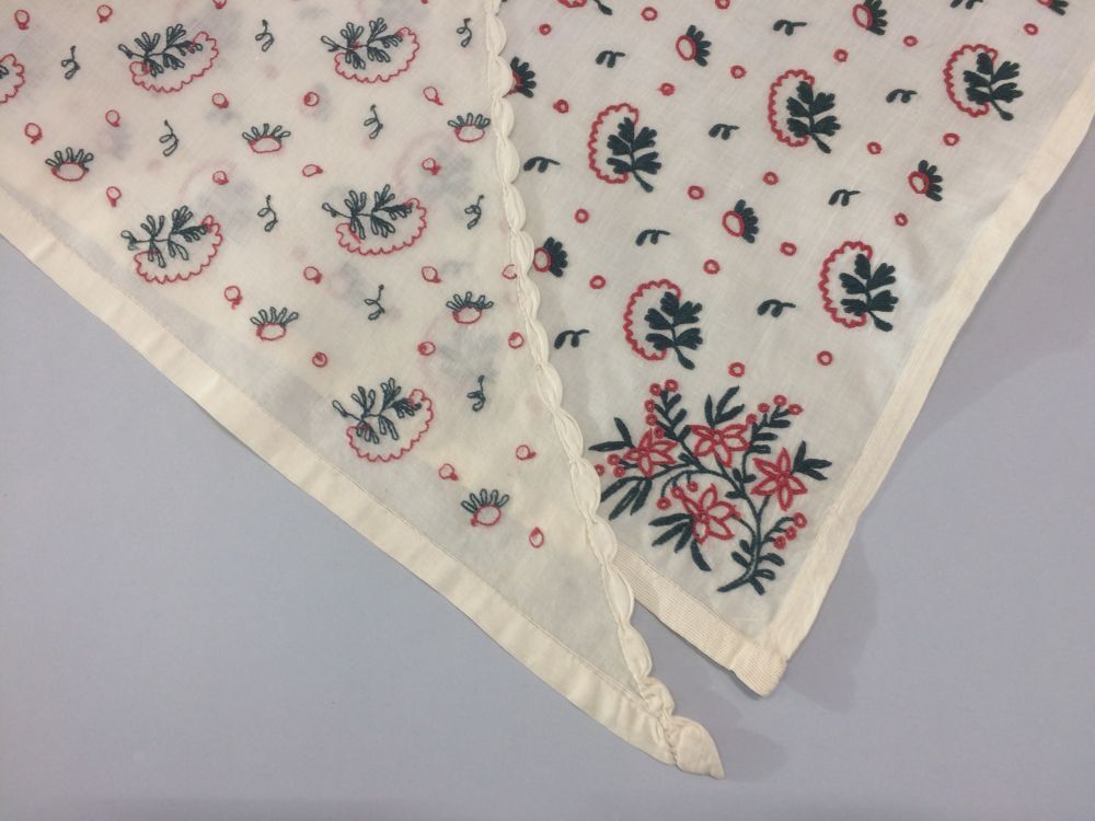 Witte fichu bezaaid met bladmotieven in rood en groen tamboereerwerk