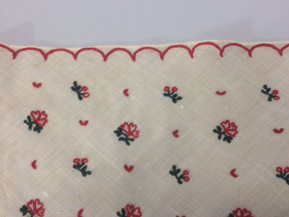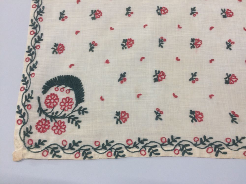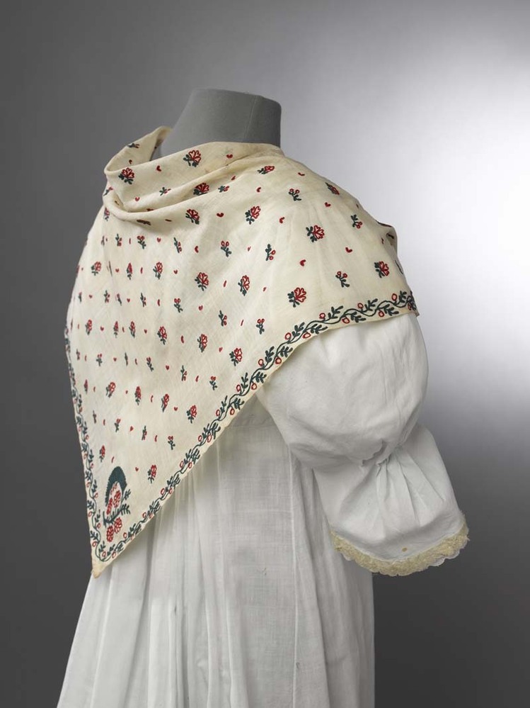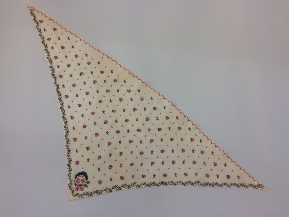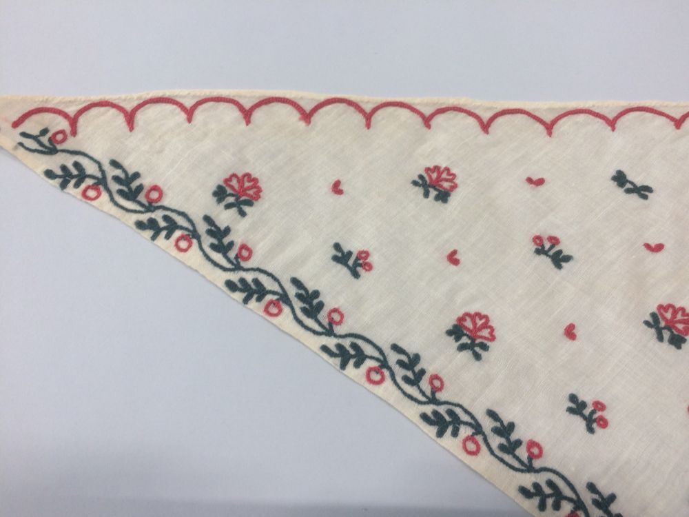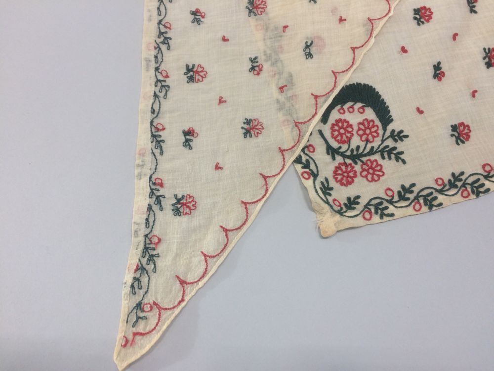 Fichu versierd met tamboureerwerk van florale motieven in groen en rood, en een rode schulplijn