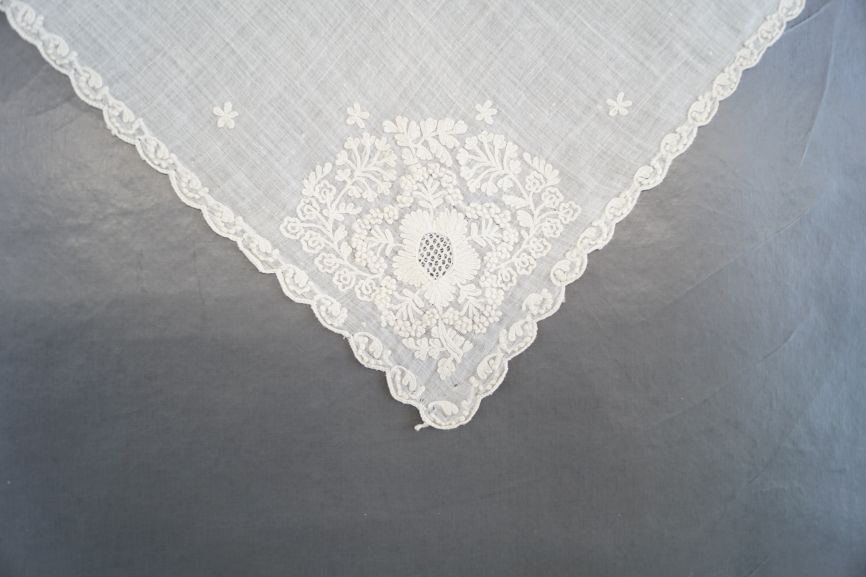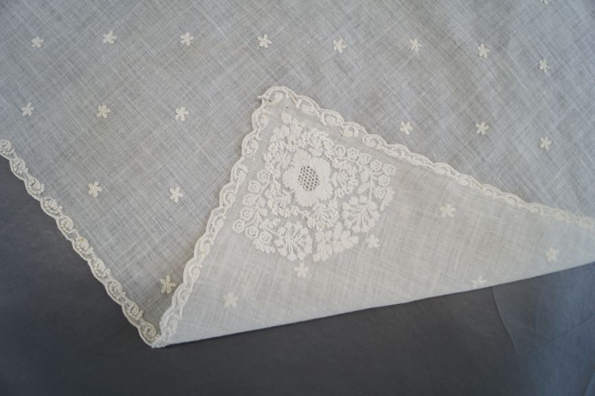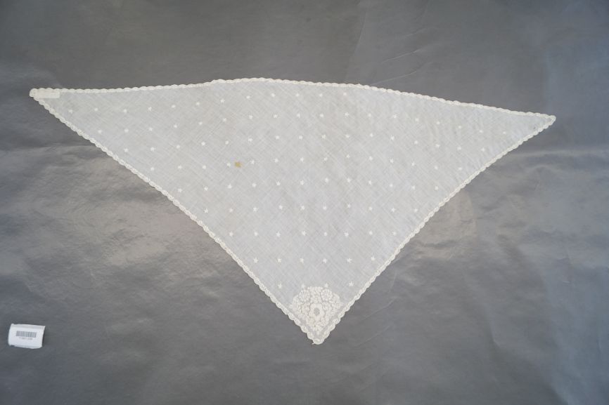 Witte tipdoek of fichu van dun katoen versierd met wit tamboureerwerk, vol kleine bloemetjes