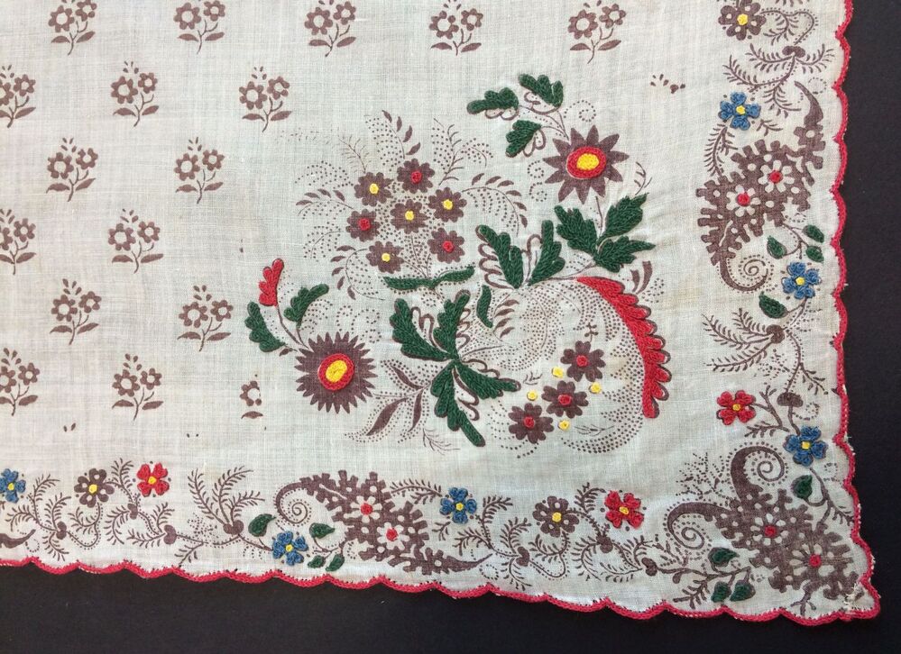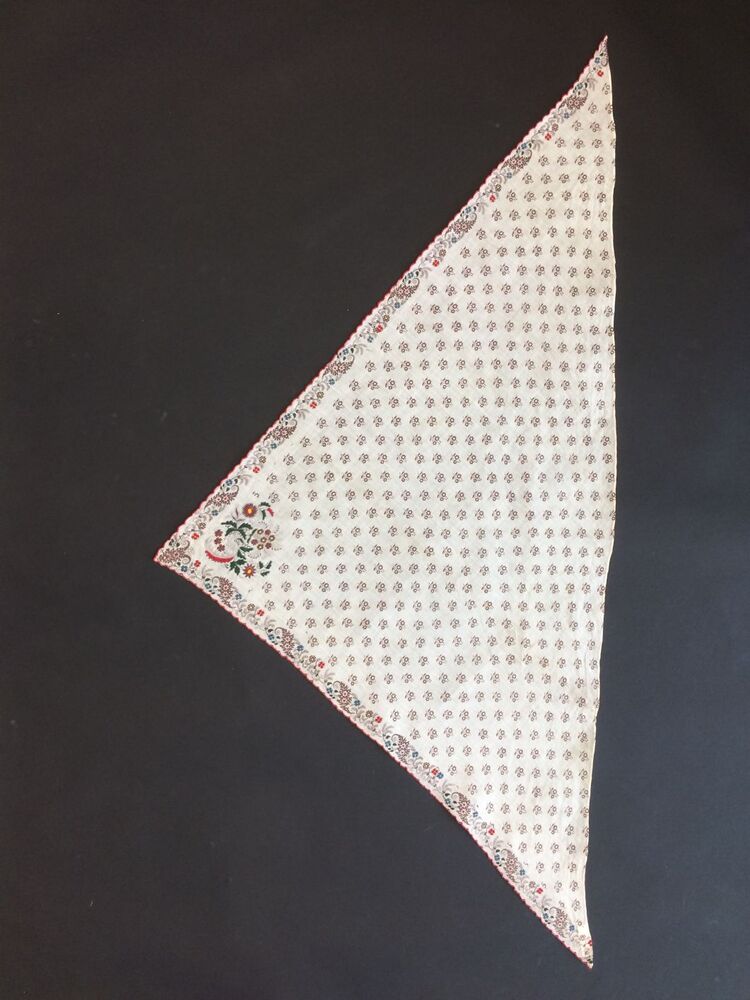 Driekante doek met wit fond bedrukt met bruin-lila bloempjes en tamboereerwerk