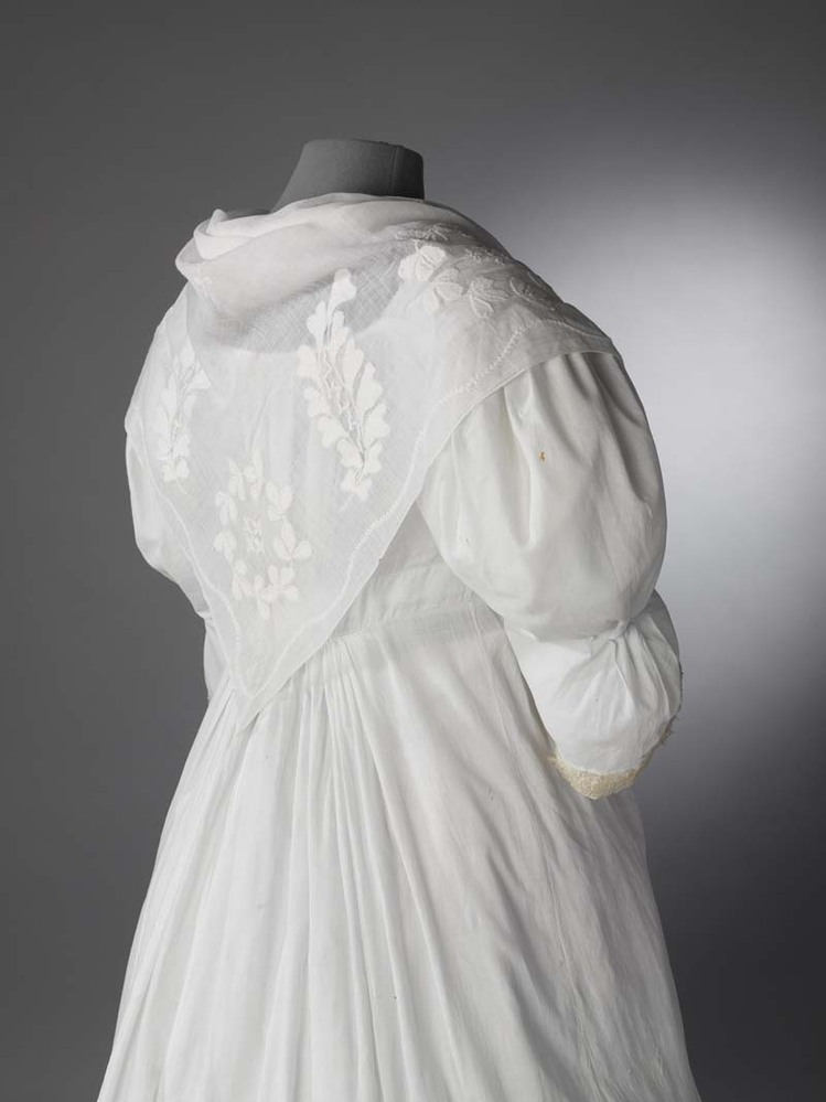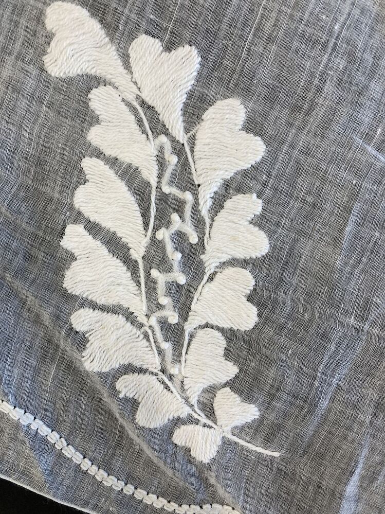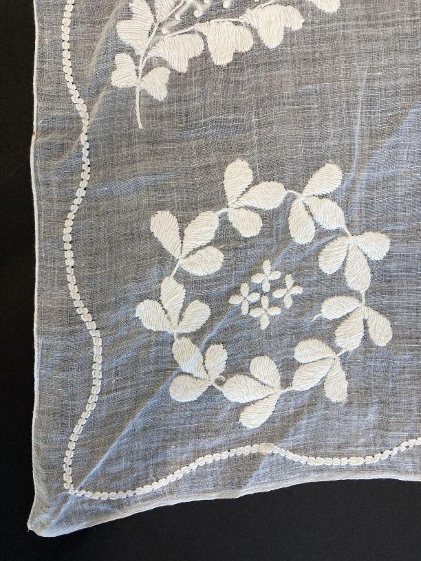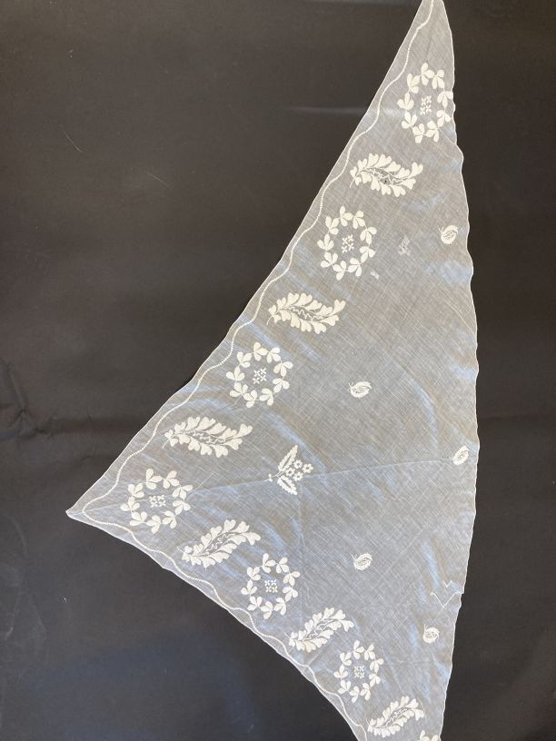 Grote witte fichu geborduurd met dikke katoenen draden in stopsteek en flanelsteek