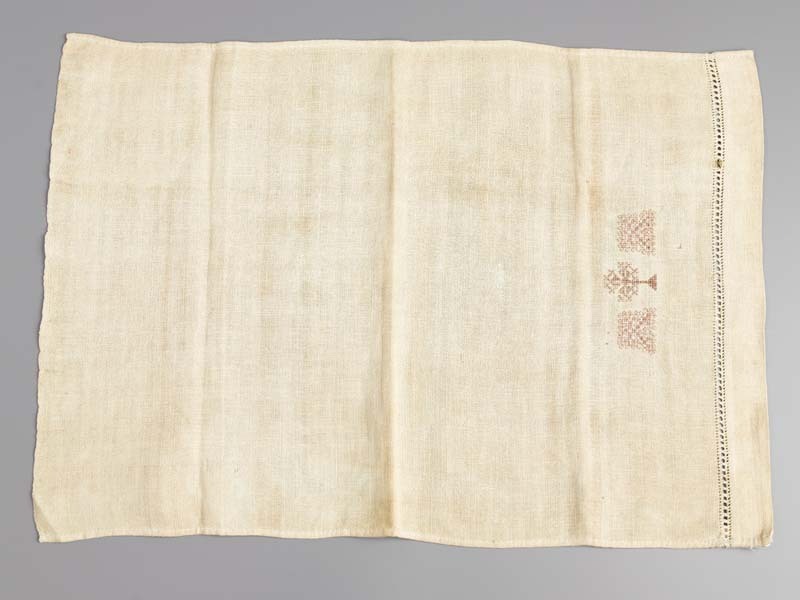 Poppenlakentje van linnen, met opengewerkt randje, levensboom, waarvan aan weerskanten de initialen AA
