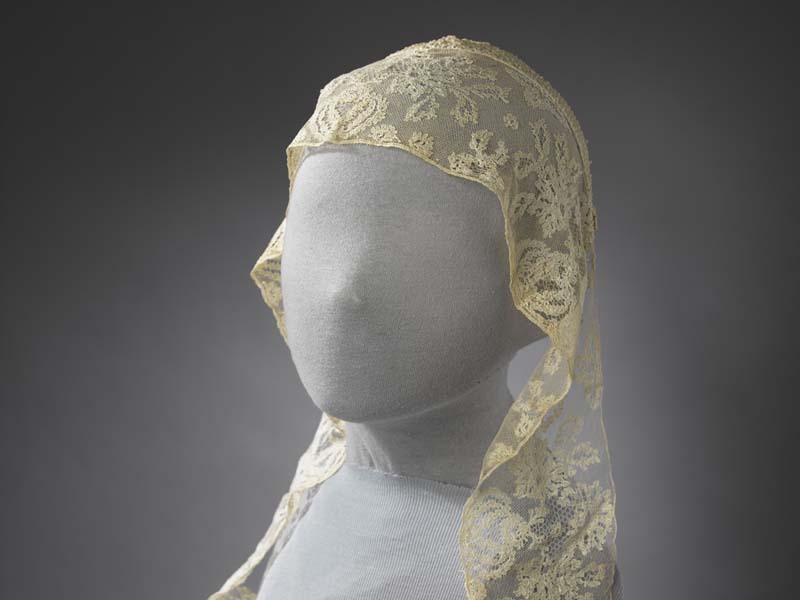 Floddermuts van tule met nopjes, de strook met doorstop- en kantwerk, strook is los