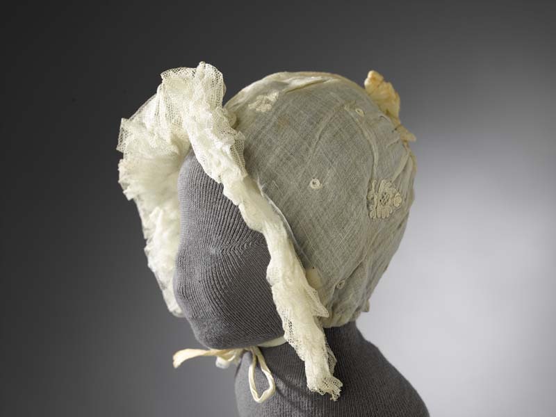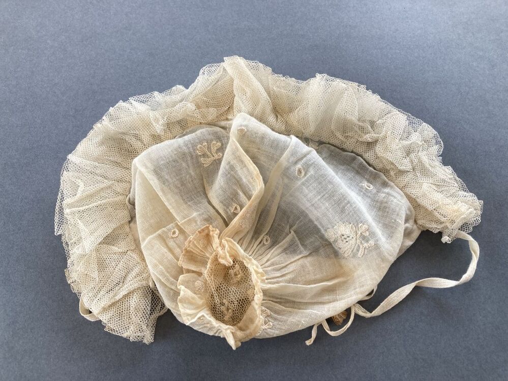 Kindermutsje van getamboereerd neteldoek met ruche langs gezicht van vier lagen tule