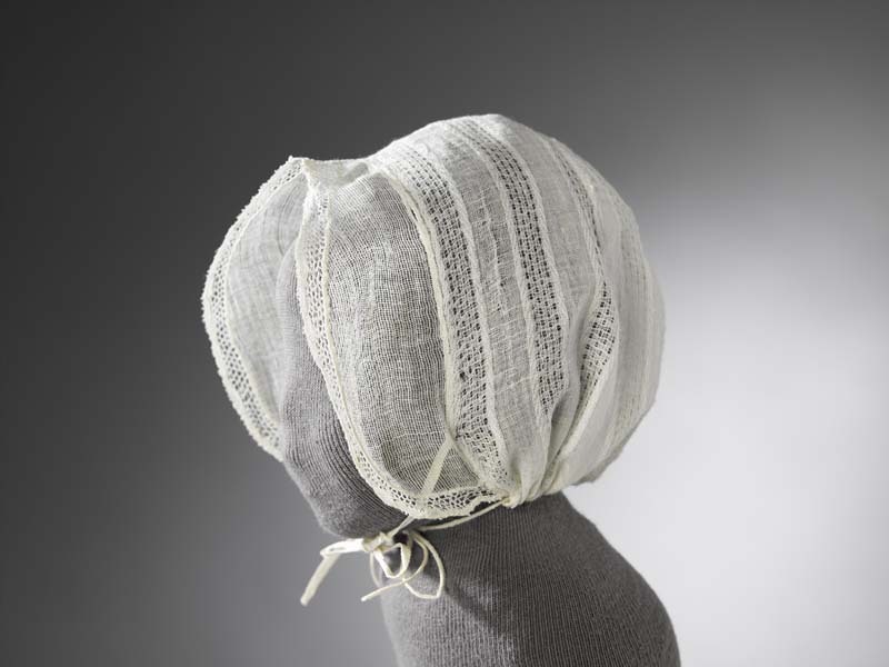 Muts van ajourgestreept neteldoek met gebogen strook langs gezicht afgezet met kloskant