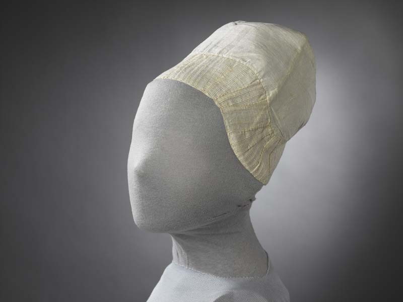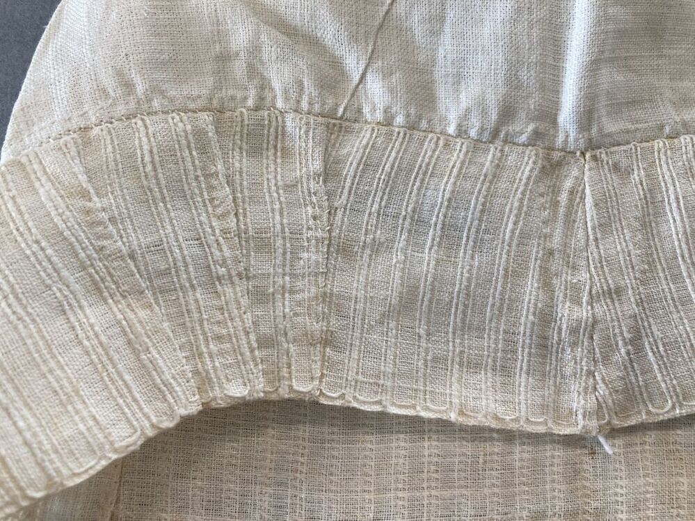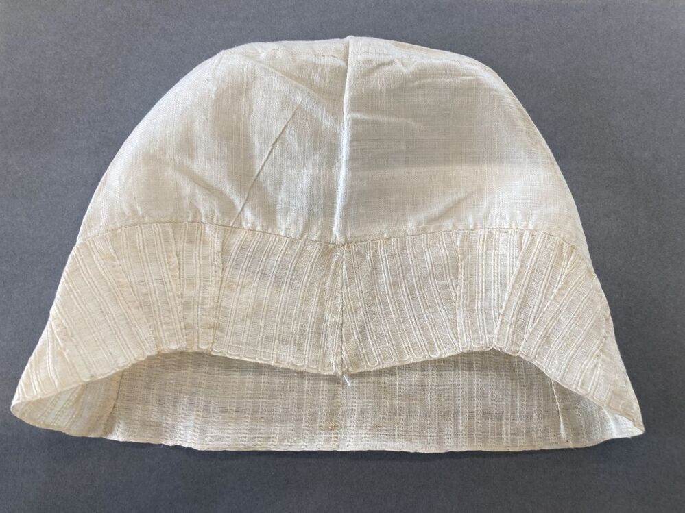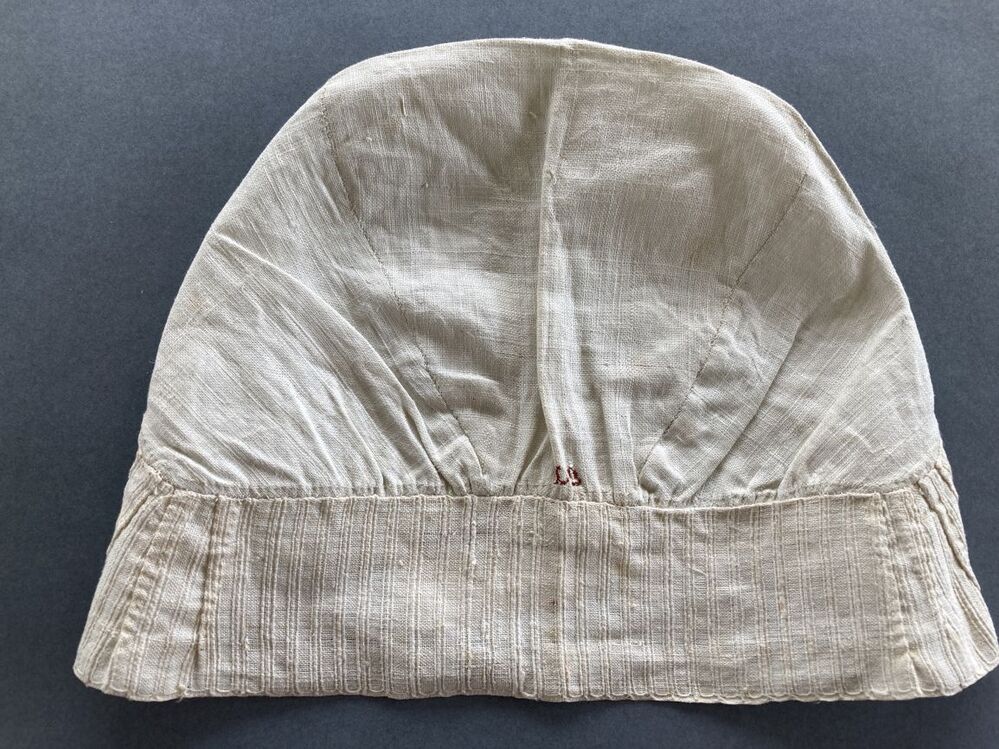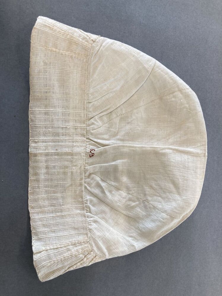 Ondermuts of tipmuts van grof linnen, de rand van langetband met ingeweven dwarsstrepen, voor de rouw. initialen LG