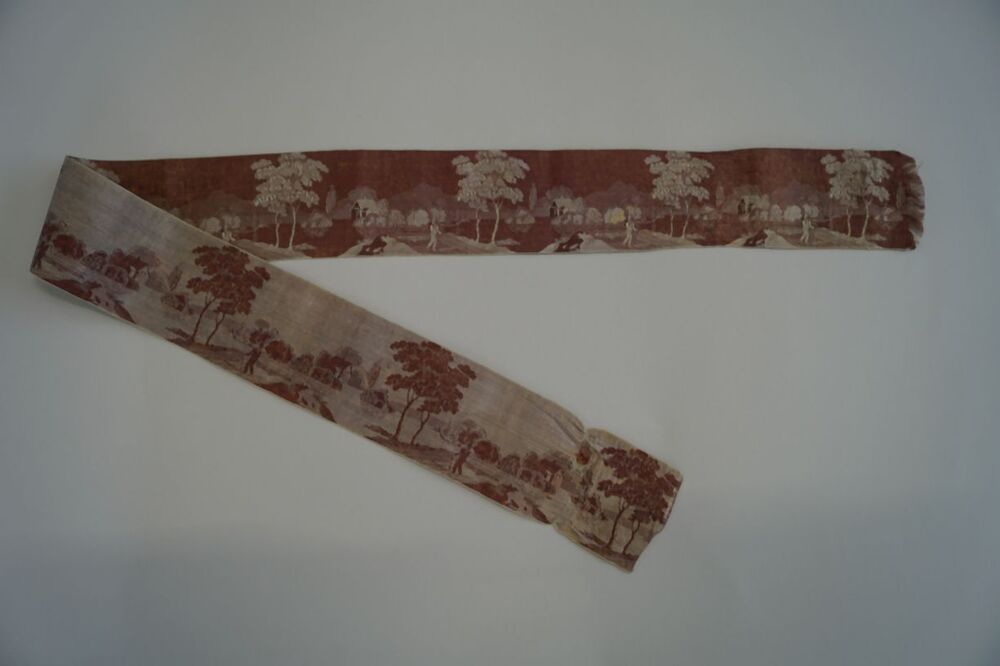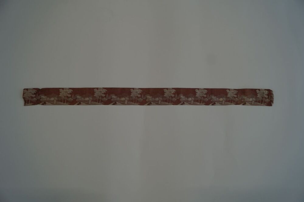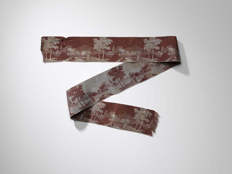 Zijden lint in donkerrood en zilvergrijs, met ingeweven landschap met wandelaar