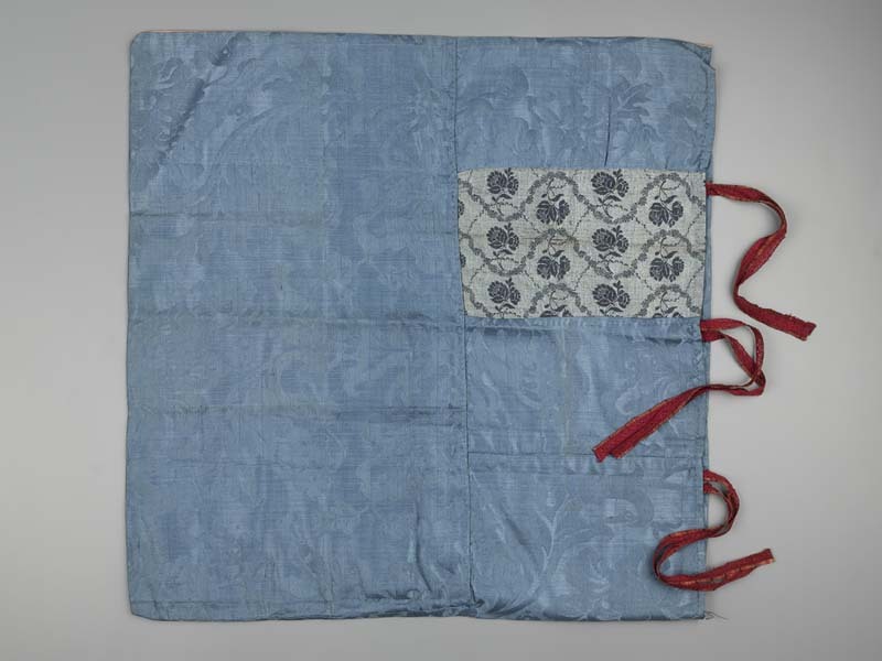Een sloop van blauwe damast met blauwe bloemmotieven, sluiting bestaat uit rode bandjes