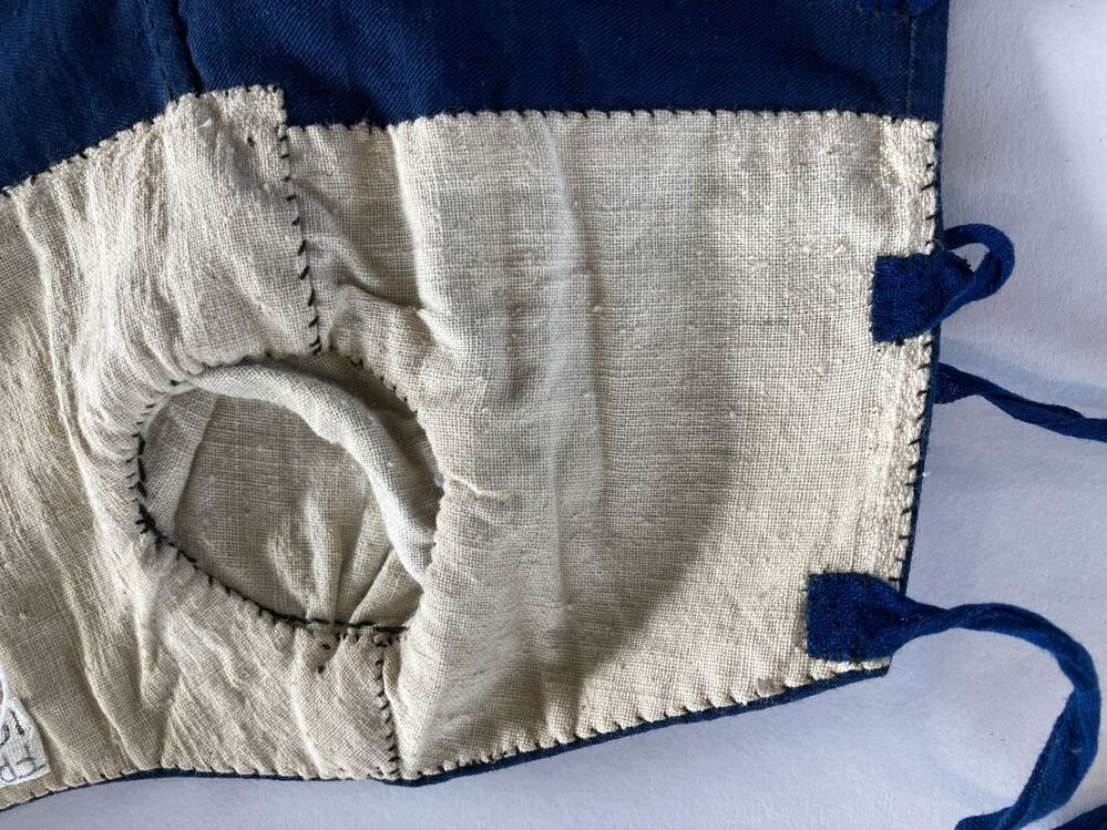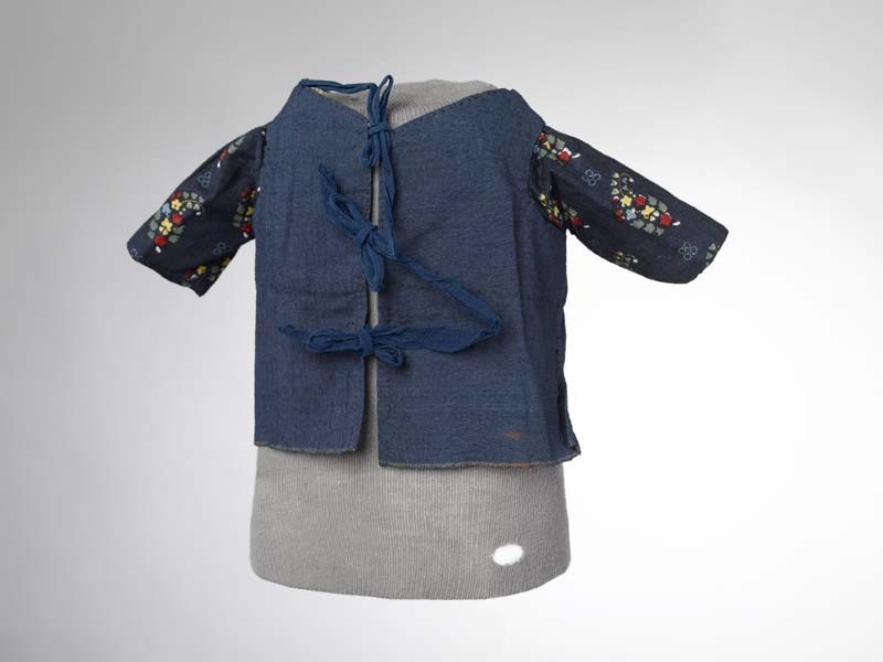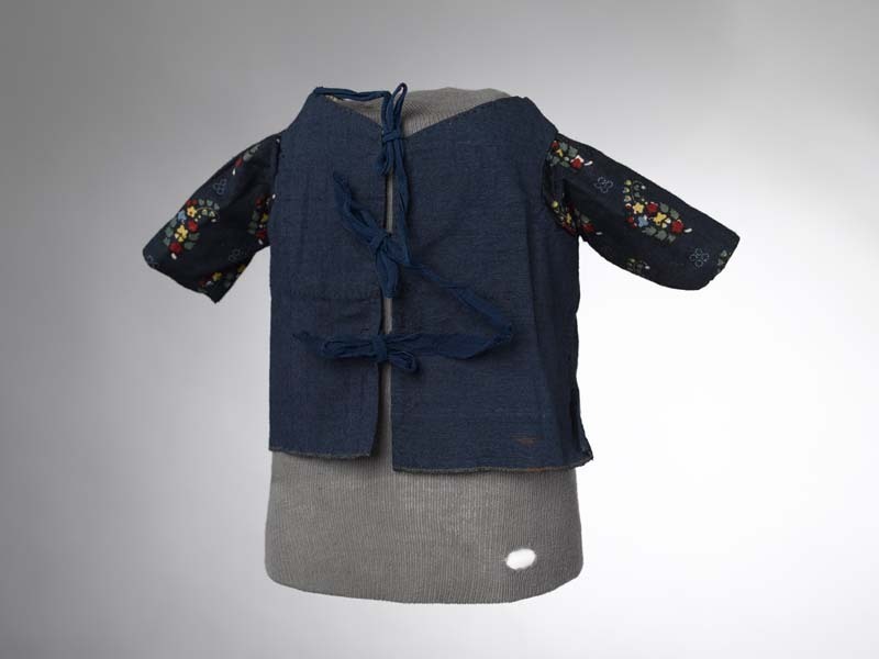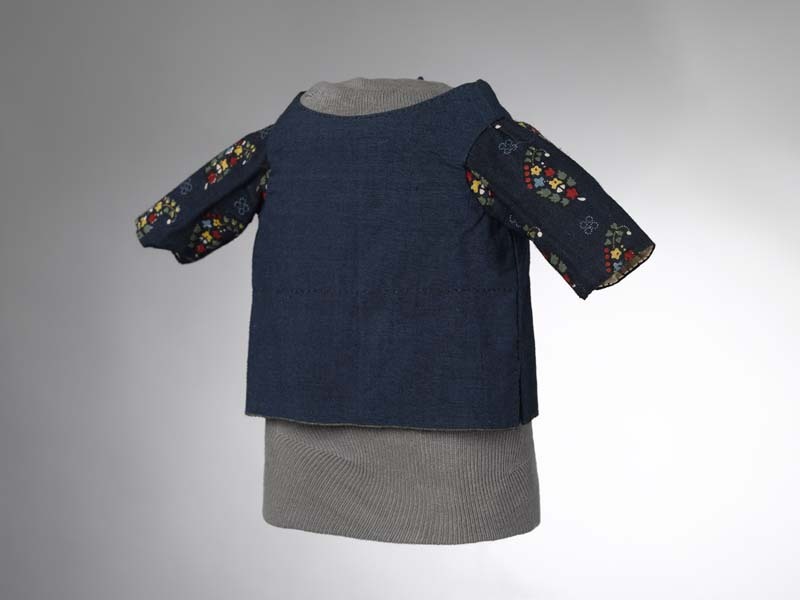 Jakje van donkerblauwe wol, de mouwen van bedrukt katoen