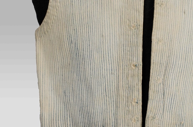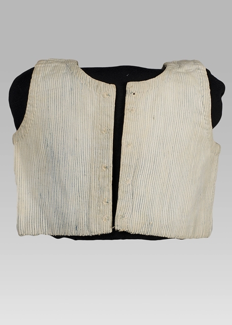 Mouwloos onderlijfje van katoen in fijn blauw-wit streepje, met linnen gevoerd, van voren open, aan weerskanten kleine gaatjes voor vetersluiting