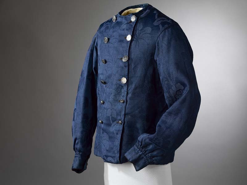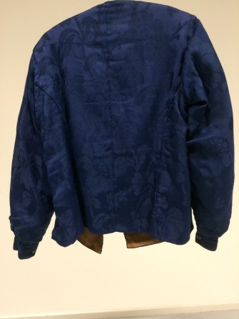 Baeitje of mannenvest van donkerblauw damast (wol) met ingeweven bloempatroon